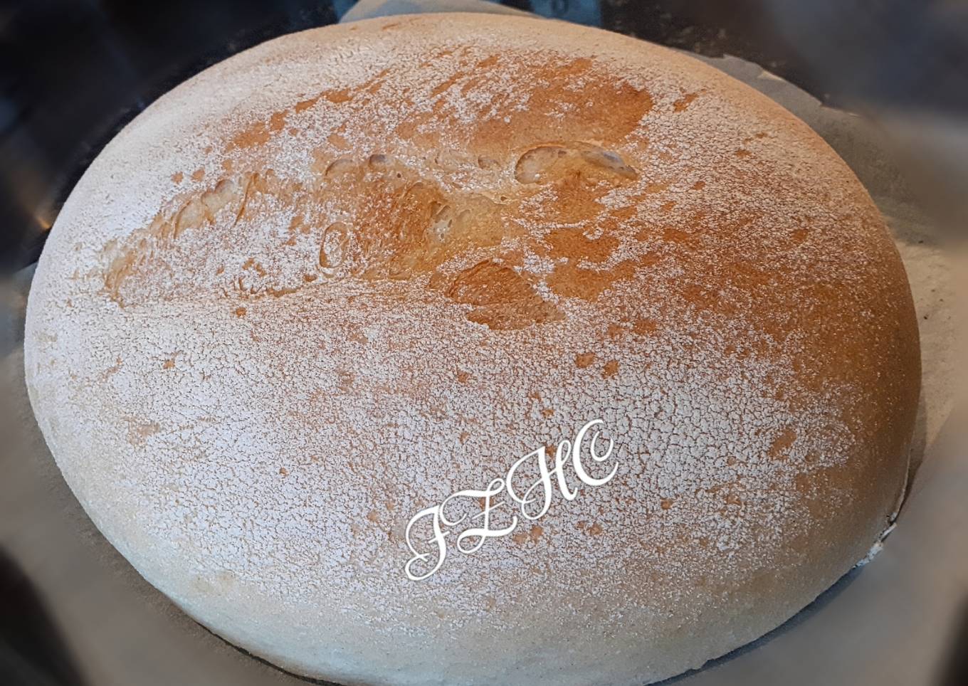 - Once the dough has risen sprinkle a little more flour on the top of the now fully risen dough and score the top of the bread.