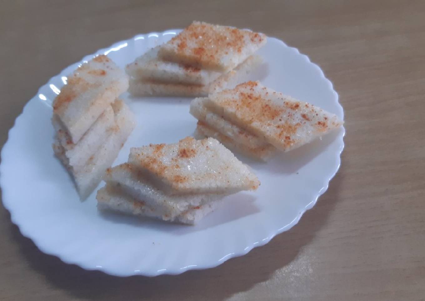 Than take the plate out sprinkle some oil and red chilli powder and cut them in diamond shape.
